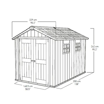 De buitenafmeting (B x D x H) is 229 x 350 cm x 242 cm, de binnenafmeting is (B x D x H) 201 x 324 x 230 cm. Kortom, met de koop van deze prachtige Keter Oakland 7511 tuinhuis heb je op betaalbare wijze een onverwoestbare en praktische extra opbergruimte in je tuin die je ook nog eens kan schilderen in iedere kleur die je maar wil.