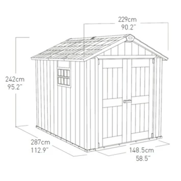 De buitenafmeting (B x D x H) is 229 x 287 cm x 242 cm, de binnenafmeting is (B x D x H) 201 x 261 x 242cm. Kortom, met de koop van deze prachtige Keter Oakland 759 tuinhuis heb je op betaalbare wijze een onverwoestbare en praktische extra opbergruimte in je tuin die je ook nog eens kan schilderen in iedere kleur die je maar wil.