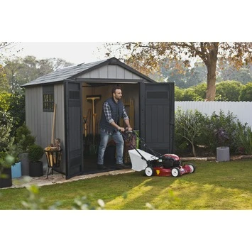 De Oakland 759 kunststof tuinhuis is voorzien van een heavy-duty vloerpaneel, een dak, een raam en full length skylight voor natuurlijke lichtinval en de dubbele deur is uitzonderlijk handig om grote tuinspullen – zoals tuinmeubelen en je grasmaaier – binnen en buiten te dragen / rollen. Goed om te weten: de tuinhuizen van Keter zijn makkelijk in elkaar te zetten en nog makkelijker te onderhouden.