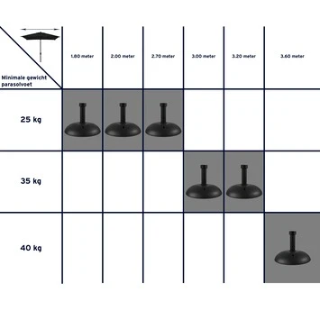 - Parasoldoek Ø350 cm: minimaal 50 kg (60 kg op plekken met veel wind)