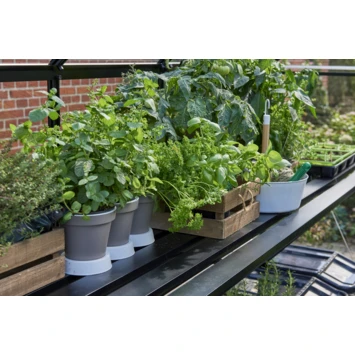 Deze zwarte geïntegreerde aluminium kweektafel is precies passend voor de tuinkas Qube 106. De lengte van de tafel is gelijk aan de binnenmaat van de zijgevel van de kas en is voorzien van dezelfde zwarte coating als de kas. De hoogte is instelbaar voor een optimale werkhouding.