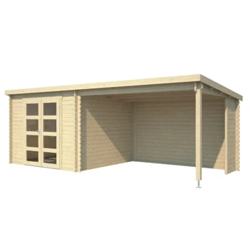 Het tuinhuis heeft een dubbele deur, voorzien van glas, zodat je overdag veel lichtinval hebt. Ook het raam aan de voorzijde zorgt voor extra licht. De deuren kun je veilig afsluiten met het bijgeleverde cilinderslot. Het platte dak helt met een heel lichte hoek met een kleine overstek voor de afwatering en wordt geleverd met een dakbedekking van asfaltvlies zodat het tuinhuis waterdicht is. Bij platte daken is het mogelijk om nog een extra laag bitumen aan de bovenkant van het dak te plaatsen om ervoor te zorgen dat het tuinhuis ook voor een langere periode beschermd is tegen water.