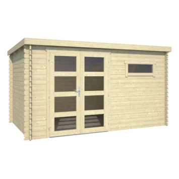 Het tuinhuis heeft een dubbele deur, voorzien van glas, zodat je overdag veel lichtinval hebt. Ook het raam aan de voorzijde zorgt voor extra licht. De deuren kun je veilig afsluiten met het bijgeleverde cilinderslot. Het platte dak helt met een heel lichte hoek met een kleine overstek voor de afwatering en wordt geleverd met een dakbedekking van asfaltvlies zodat het tuinhuis waterdicht is. Bij platte daken is het mogelijk om nog een extra laag bitumen aan de bovenkant van het dak te plaatsen om ervoor te zorgen dat het tuinhuis ook voor een langere periode beschermd is tegen water.